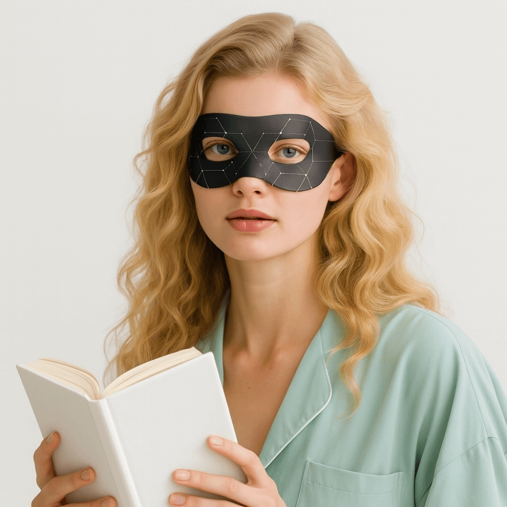 Setzen Sie Bella Lift wie eine Schlafmaske auf und befestigen Sie sie mit den Bändern. Schalten Sie das Licht mit der Fernbedienung ein und wählen Sie Ihre Einstellung.
